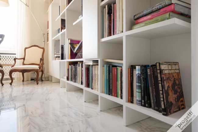 Libreria laccata bianca progettata su misura per il cliente, che necessita di molto spazio ed un settore specificatamente dedicato ad un’unica ingombrante collana di libri da porre in alto, illuminata dalle lampade LED. La componibilità del sistema progettuale permette di adattarsi a tutte le esigenze di arredamento, decidendo in piena libertà dove porre i vani…