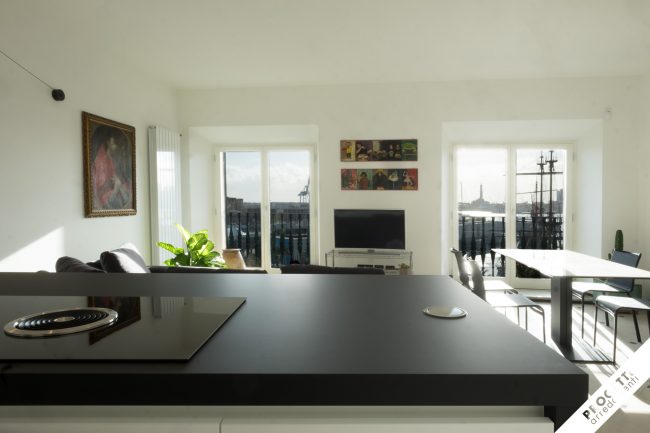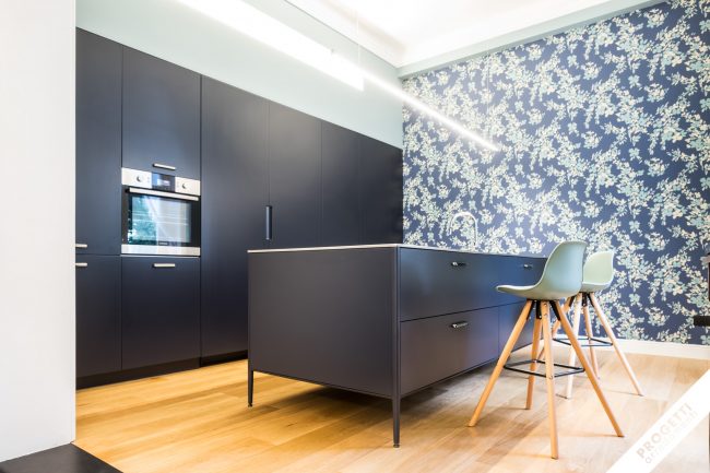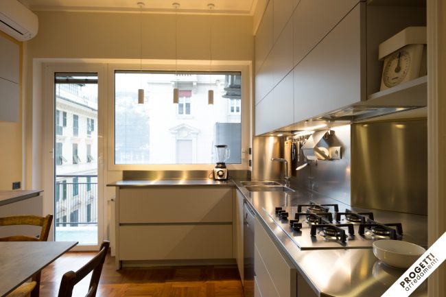 Una delle prime cucine Unit che consegnammo, in un bel palazzo del centro di Genova. Cucina Cesar Unit con ante laccato seta colore “notturno”. Maniglie “shell” color nickel nero. Top in acciaio spazzolato spessore 12 mm con lavello sotto-top saldato.